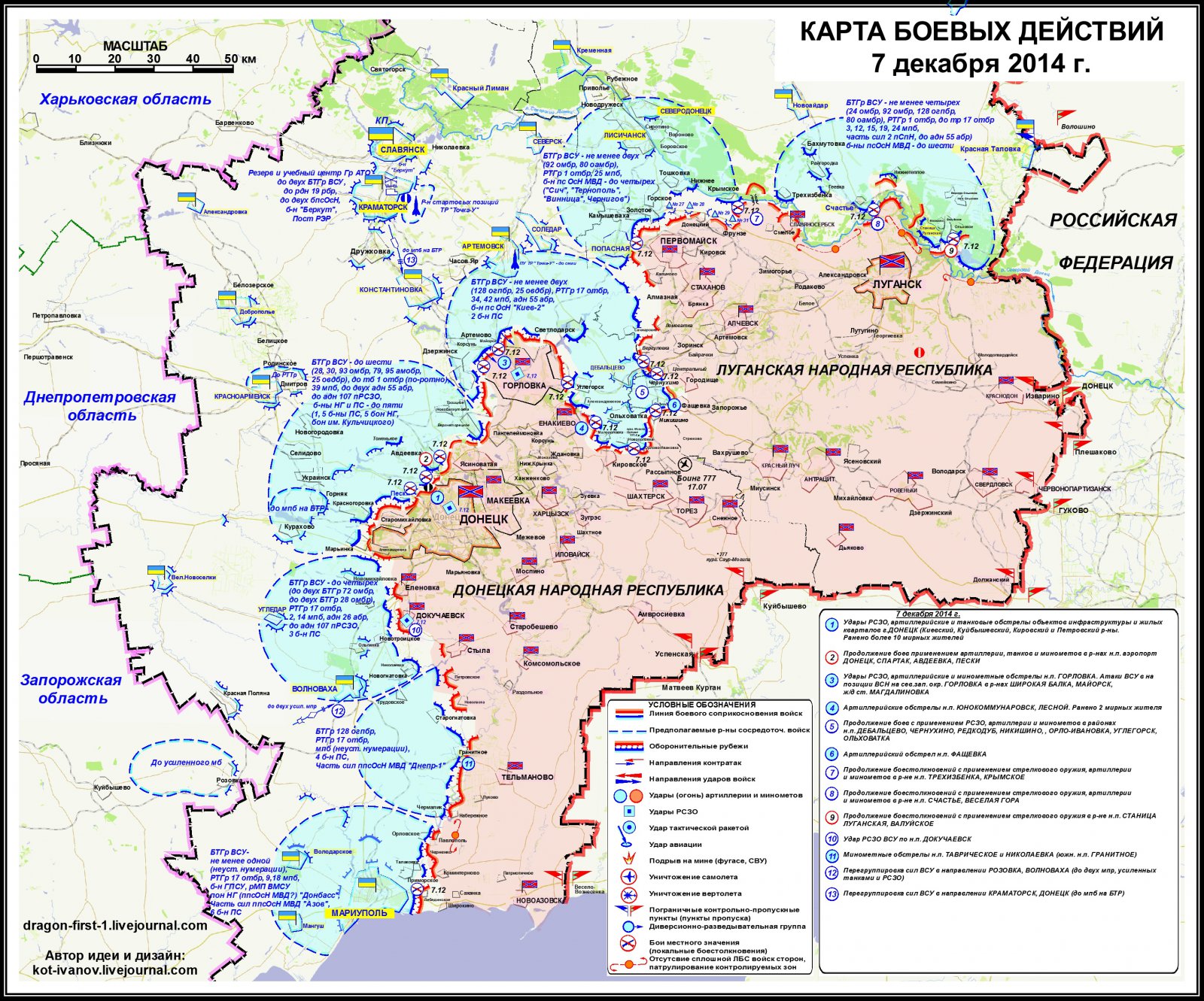 Пока же, 8 декабря, украинские силовики продолжают подтягивать всё новые силы к линии фронта, а на юге ДНР начали применение тяжёлых орудий 2С7 «Пион». Огневые столкновения были зафиксированы на всей линии фронта от Опытного до Авдеевки. Ополченцы активно продвигаются вглубь райцентра Станица Луганская, и в случае объявления очередного перемирия наступление ополченцев на данном участке захлебнётся.