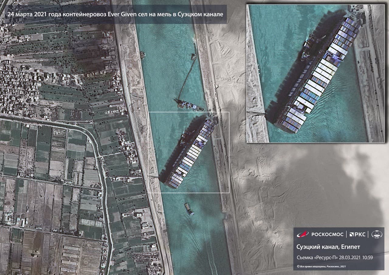 "Суэцкий канал, съемка спутником "Ресурс-П". Суперконтейнеровоз пока на мели", - написал Рогозин.