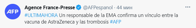 Представитель ЕМА Марко Кавалери заявил, что возможна причинно-следственная связь между образованием тромбов и вакциной. Ожидается, что на этой неделе будет представлена обновленная оценка.