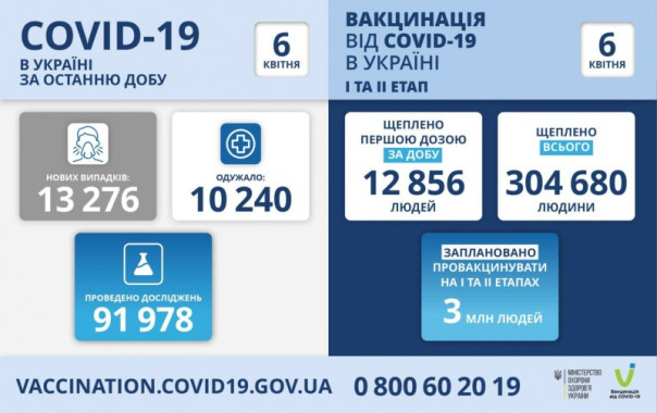 Как сообщает Минздрав, по состоянию на 5 апреля на Украине привито 304 678 человек.
