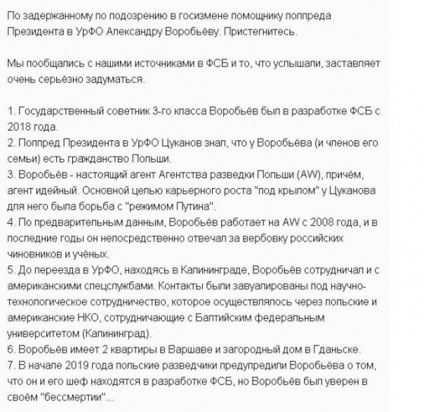 Тут необходимо сказать, что с 4 июля 2018 года по 16 ноября 2020 года Николай Цуканов являлся членом Совета безопасности Российской Федерации - конституционного органа при Президенте РФ, осуществляющего подготовку решений главы государства по вопросам обеспечения национальной безопасности России, её независимости и государственной целостности. При обысках у Александра Воробьёва, помимо пшековского паспорта и звукозаписывающей аппаратуры, спецслужбисты обнаружили кучу рабочих документов с заседаний Совбеза. Содержащиеся в них сведения он, судя по всему, передавал полякам.
