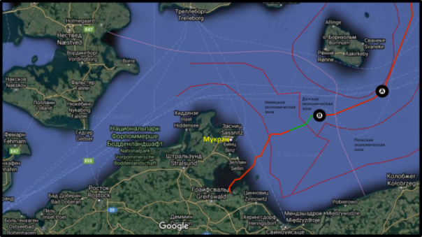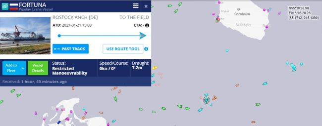 Судя по навигационным картам, сегодня утром «Фортуна» находилась прямо у «Северного потока» и в 1,6 километра от точки, где трасса второго балтийского газопровода сворачивает на юго-запад и начинает идти параллельно «Северному потоку». Маршруты газопроводов отличаются, так как первый газопровод уложили в территориальных водах Дании у острова Борнхольм, а второй из-за позиции Копенгагена укладывают в обход.