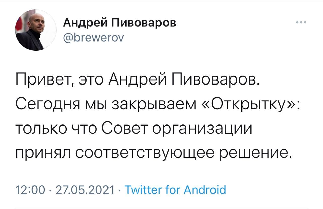"Все члены "Открытки"* исключены из организации, а их членство аннулировано — во избежание возможного преследования", — приводятся слова Пивоварова в публикации.