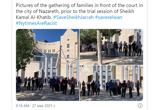 Десятки палестинских политических деятелей и активистов в Израиле провели демонстрацию перед судом в Назарете против процесса над Аль-Хатибом. Заседание проходило под усиленной охраной.