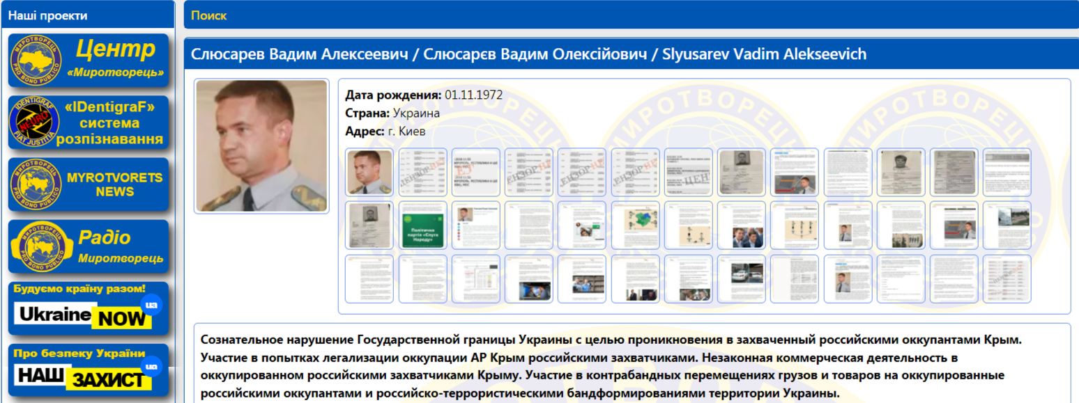 По данным «детективов» из «Миротворца», он занимался в Крыму коммерческой деятельностью, а также участвовал «в контрабандных перемещениях грузов и товаров на оккупированные территории».