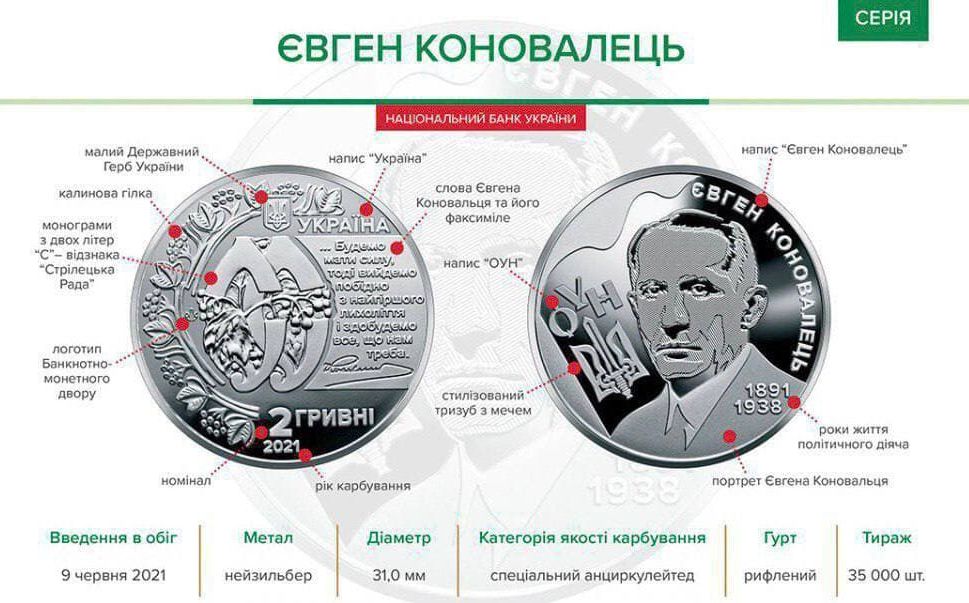 Национальный банк Украины решил расширить серию памятных монет «Выдающиеся личности Украины», запечатлев очередного украинского «героя» — основателя Организации украинских националистов (ОУН) Евгения Коновальца.