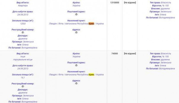 Напомним, Елена Зеленская в 2013 году приобрела в приморском посёлке Ливадия под Ялтой в ЖК «Император» элитный трёхкомнатный пентхаус с видом на море и горы площадью 129,8 квадратных метров. Согласно декларации, Елена Зеленская купила её за более чем 1,3 миллиона гривен. По этому же адресу на Зеленскую зарегистрировано паркоместо площадью 16,1 квадратных метров, которое было приобретено за 74 тысячи гривен. Источник