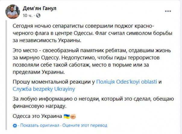 В ночь со среды на четверг, 10 июня, в центре Одессы подожгли красно-черный флаг на мемориале погибшим 2 мая 2014 года евромайдановцам. Об этом в Facebook сообщил бывший боец «Правого сектора», лидер «Уличного фронта» Демьян Ганул, родом из села Новоселецкое Кировоградского района Кировоградской области, сейчас проживающий в Одессе.