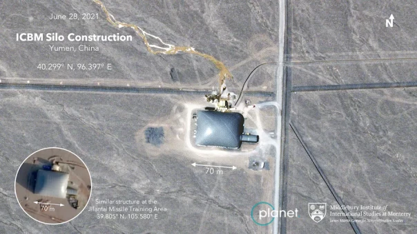 Коммерческая спутниковая фотография, сделанная в понедельник над северо-западным Китаем, показывает, что, по мнению экспертов, является строительной площадкой для новой шахты для МБР с ядерным наконечником. Стройплощадка скрыта под 230-футовым укрытием-обычная практика сокрытия, наблюдаемая на других китайских ракетных объектах