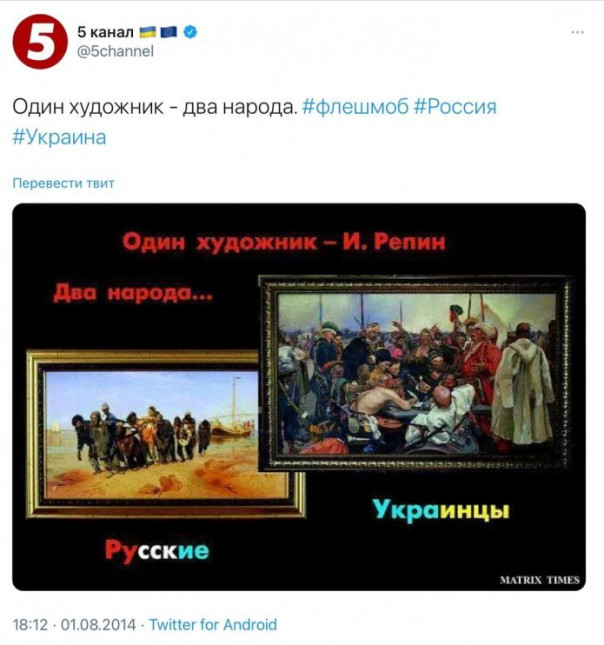 Конечно же, подчеркнул, что русские и украинцы - совершенно разные народы. А разница между народами, по его мнению, прослеживается в творчестве художника Ильи Репина: