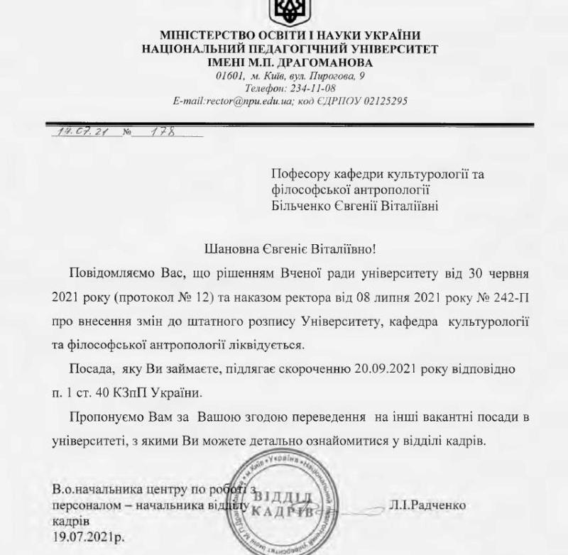 «Меня уволили. Ну, вот. Ради этого пошли на ликвидацию целой кафедры. Не смогли ничего доказать: ни профнепригодность, ни аморальный поступок — ничего из того, что вешали», — сообщила профессор НПУ им. Драгоманова на своей странице в Facebook.