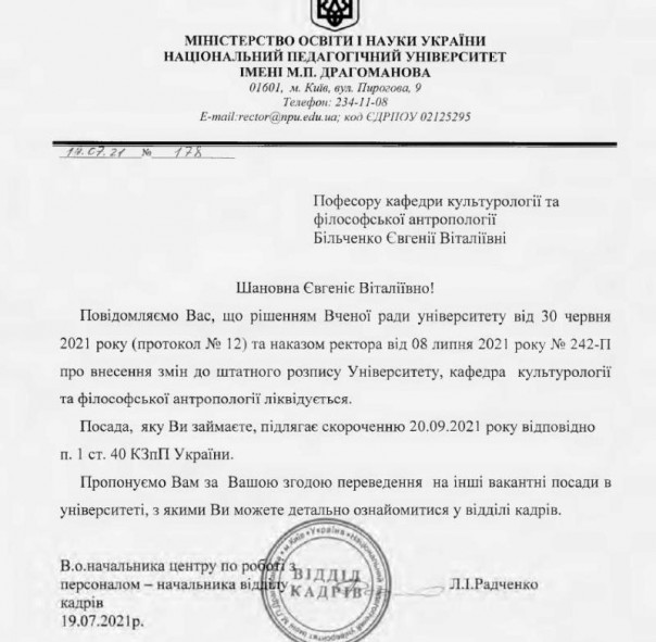 Ради увольнения Бильченко ВУЗ ликвидировал кафедру
