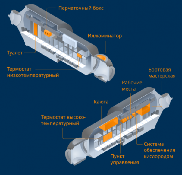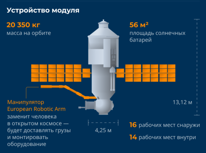 В ней есть спальное место космонавта, туалет, системы регенерации кислорода из воды и воды из урины, рабочие места для проведения экспериментов. Она также оборудована шлюзовой камерой для выноса наружу станции научного оборудования и европейским дистанционным манипулятором ERA.