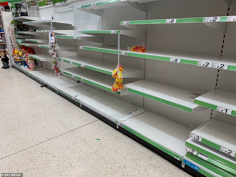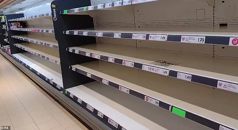 Один покупатель из Lidl в Мирфилде, Западный Йоркшир, сказал MailOnline, что ситуация была "насмешкой" и ощущалась как начало блокировки 2020 года, описав "пустые морозильные камеры, почти нет вина и практически нет моющего средства", добавив: "Далее будет нормирование".
