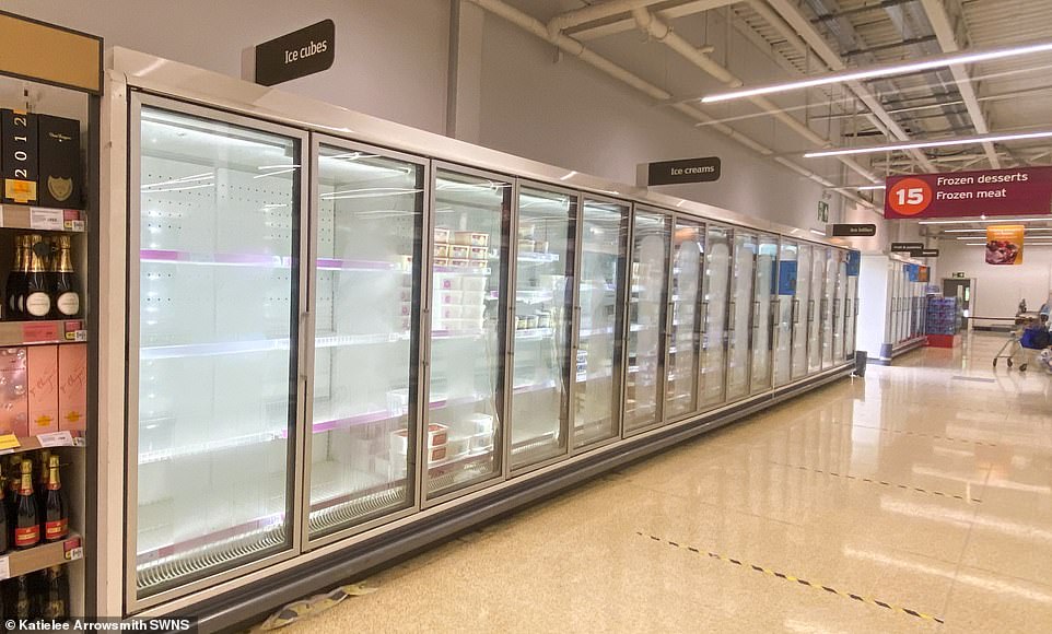 Морозильные камеры пустые в Sainsbury's в Крейглите, Эдинбург, за ночь, как "pingdemic" уничтожает британских ритейлеров