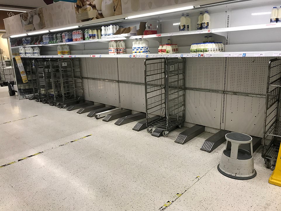 В магазинах Sainsbury's, Tesco, Aldi, Morrisons, Asda, M&S and Waitrose можно наблюдать значительные пробелы на полках, конкретно вина, замороженных продуктов, свежего мяса, таких как говядина, молочных продуктов, сыров, пиццы, воды, фруктов, овощей и упакованных салатов и колбасных изделий (надеюсь, сухари, минтай и морская капуста не пострадали, как и в нашу Перестройку - Mike1975).