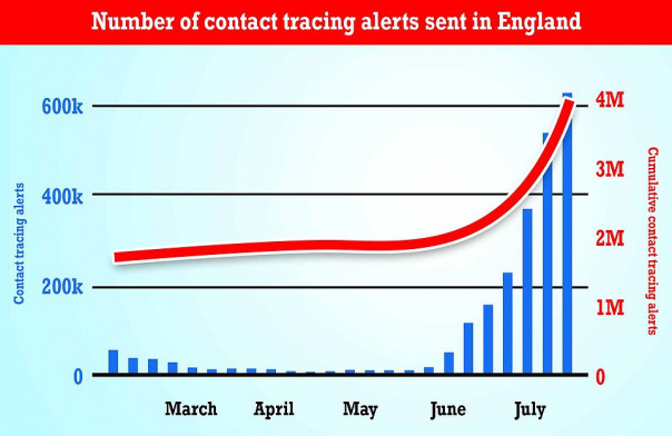 Рекордные 618 903 предупреждения были отправлены пользователям приложения NHS Covid-19 в Англии и Уэльсе за неделю до 14 июля, сообщив им, что они были в тесном контакте с кем-то, кто получил положительный результат на коронавирус.