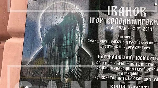 В Одессе неизвестные плеснули зеленкой на табличку в "память о гибели 2 мая 2014" года члена «Правого сектора» Игоря Иванова.