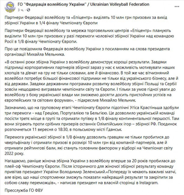 «В последние годы сборная Украины по волейболу демонстрирует хорошие результаты. Благодаря поддержке корпоративных партнёров сборной сейчас у нас есть возможность мотивировать наших ребят на игру не только словами, но и финансово. В то же время отечественный волейбол нуждается в большей финансовой поддержке не только от украинского бизнеса, но и от государства. Благодаря государственным программам развития волейбола сборные Польши и Сербии совсем недавно выигрывали чемпионаты мира и Европы», — отметил президент ФВУ Михаил Мельник.