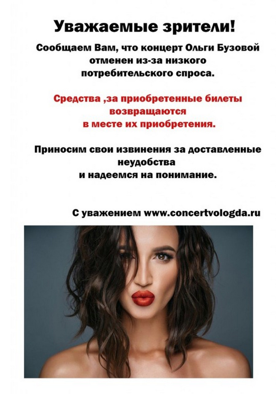 Концерт Ольги Бузовой в Вологде, который должен был состояться 29 сентября в местном Дворце спорта, отменили из-за низкого интереса потенциальных слушателей. Население просто не стало покупать билеты.
