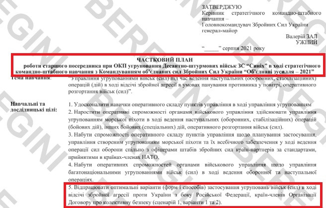 В пятом пункте указано, что в процессе учений будет отрабатываться применение группировок войск в ходе отпора вооруженной агрессии против Украины со стороны Российской Федерации и стран-членов Организации Договора о коллективной безопасности.