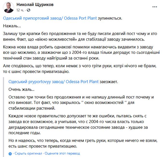 «Одесский припортовый завод останавливается. К сожалению… Оставлю три точки без продолжения и не будут писать длинный пост о том, почему и кто виноват. Факт, что «окно возможностей» для стабилизации завода закрылось… Каждая власть делает одинаковые ошибки, пытаясь выдавить с завода все, что возможно, а учитывая, что с 2004 года власть только деградирует, то сегодняшнее техническое состояние завода – самое худшее за последние годы. Но надеюсь, что теперь, когда не на чем греть руки, которые ничего не брали, есть шанс провести приватизацию», — написал Щуриков.