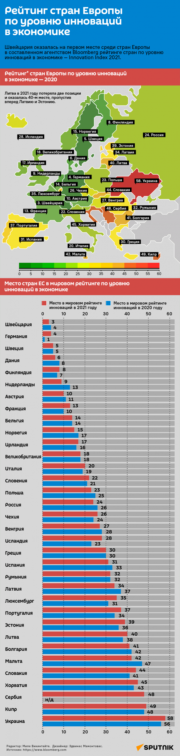 Sputnik Литва на базе данных Bloomberg составил собственный рейтинг стран Европы по уровню инноваций в экономике. Всего в нем представлены 34 государства. При его составлении учитывались десятки показателей, объединенные по следующим направлениям: