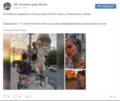 В отношении 30-летней петербурженки возбудили уголовное дело об оскорблении чувств верующих за кадры в полуобнаженном виде на фоне Исаакиевского собора, сообщили в ГСУ СК по городу.