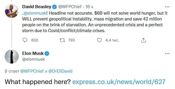 Илон Маск же написал в Twitter исполнительному директору Всемирной продовольственной программы ООН (ВПП) Дэвиду Бизли, что вполне готов пожертвовать деньги, но только при условии строгой и открытой финансовой отчётности, чтобы люди видели, на что ООН тратит средства.