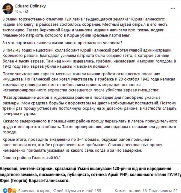 В Умани торжественно отметили 120-летие «выдающегося земляка» Юрия Галинского, грабившего евреев и создавшего на территории Украины гетто. Об этом сообщил директор Украинского еврейского комитета Эдуард Долинский на своей странице в Facebook.