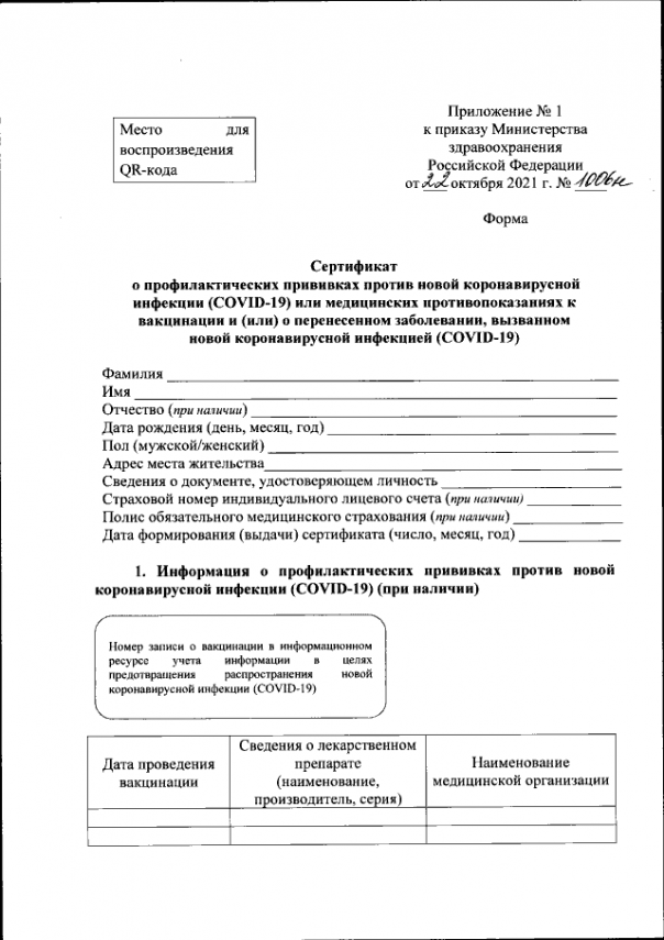 "Утвердить: форму медицинской документации "Сертификат о профилактических прививках против новой коронавирусной инфекции (COVID-19) или медицинских противопоказаниях к вакцинации и (или) перенесенном заболевании, вызванном новой коронавирусной инфекцией", — говорится в документе.
