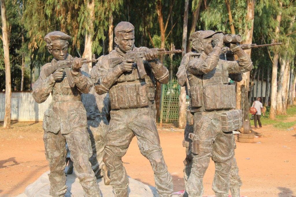 На фото видно, что две центральных фигуры скульптурной композиции это русские — один всматривается вдаль в бинокль, второй целится из автомата. Чуть позади них по бокам — африканцы.