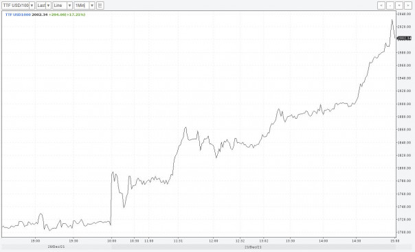 Спотовые цены на природный газ в Европе вышли на исторический максимум, впервые превысив отметку в $2 тыс. за 1 тыс. кубометров. Стоимость январского фьючерса на газ по индексу самого ликвидного европейского хаба TTF в Нидерландах незадолго до 15:00 мск достигла €170,3 за МВт·ч, что составляет более $2,01 тыс. за 1 тыс. куб. м по текущему курсу, следует из данных биржи ICE.