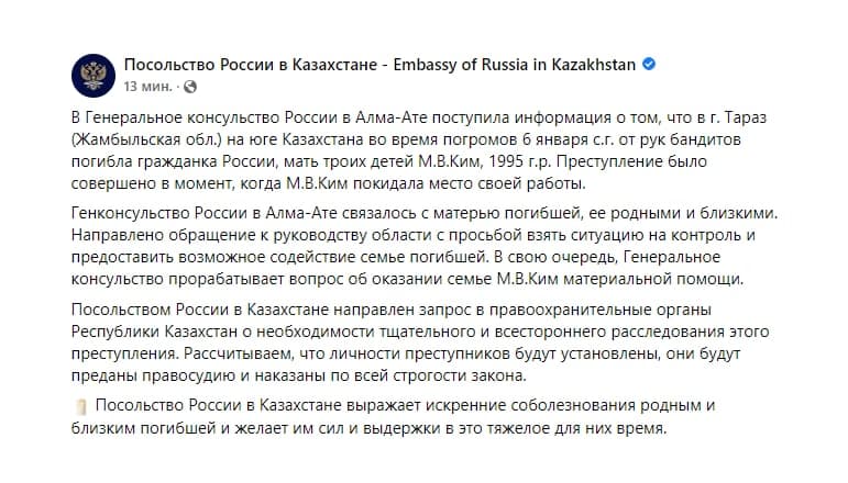 Во время беспорядков в Казахстане погибла гражданка России, мать троих детей