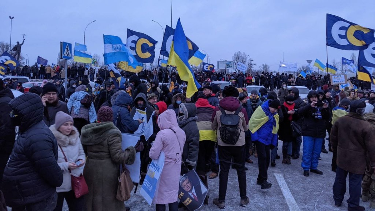 В аэропорту Жуляны собралось около тысячи человек. Митингующие с партийной символикой группами выстроились перед аэропортом.