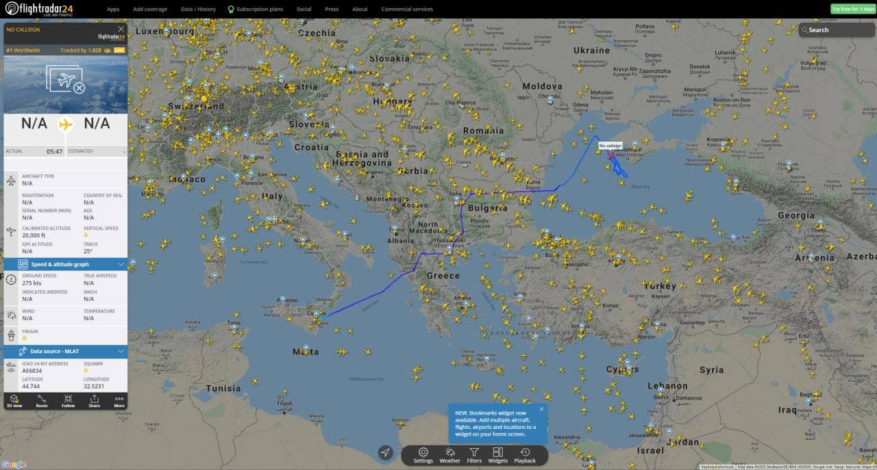 Похоже, НАТО поднадоело, что за полетами военных самолётов альянса над Украиной следит весь мир, поэтому сегодня с утра вдоль побережья Крыма кружит неизвестный (с точки зрения сервиса Flightradar) самолет.