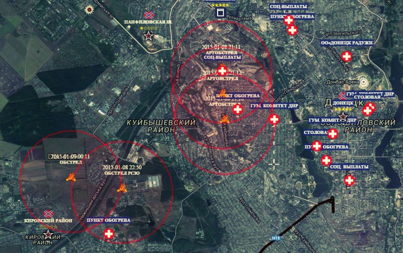 В ночь с 8 на 9 января, а также в течение всего дня до позднего вечера 9 января Донецк подвергался массированным артиллерийским обстрелам со стороны украинских силовиков с направлений населённых пунктов Галицыновка, Красногоровка, Пески, Тоненькое, Опытное, Авдеевка, Марьинка. Обстрелы велись с применением тяжёлой артиллерии и систем залпового огня. Под обстрелами находились Петровский, Куйбышевский, Кировский, Киевский районы. В результате обстрелов были зафиксированы массовые разрушения домов и коммуникаций (вышли из строя газопроводы, водоканалы и подстанции обстрелянных районов), есть пострадавшие среди мирного населения. Сообщалось о двух погибших и не менее семи раненных, раненым оказывается медицинская помощь, на повреждённых объектах во время затишья ведутся ремонтные работы.