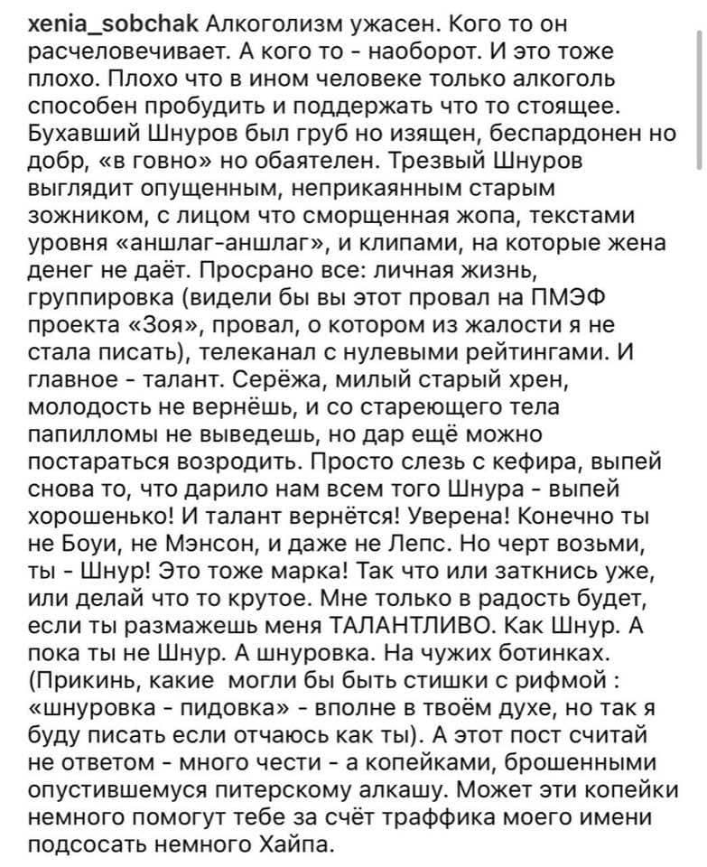 "Трезвый Шнуров выглядит опущенным, неприкаянным старым зожником, с лицом что сморщенная жопа. Я была бы рада, если бы ты размазал меня талантливо. Как Шнур. Но пока ты не Шнур. А шнуровка. На чужих ботинках", - написала Собчак.