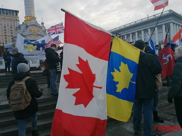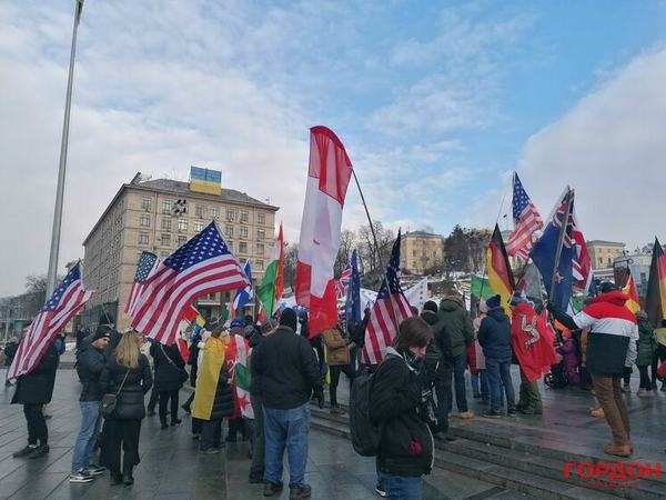 В воскресенье, 6 февраля, живущие в Киеве иностранцы провели акцию в поддержку Украины на фоне угрозы очередного "вторжения" России. Колонна участников акции прошла с флагами западных государств от парка имени Шевченко до Майдана Незалежности