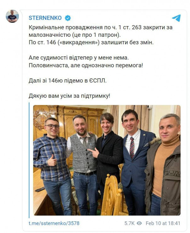 Ещё одну статью (разбой, по которой Стерненко суд первой инстанции дал 7 лет тюрьмы) ещё раньше отменила апелляция).
