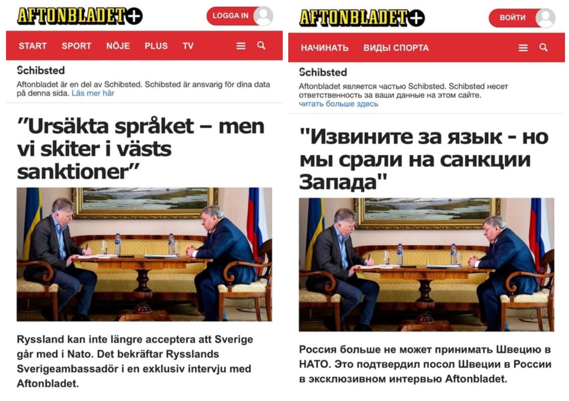Ранее шведская газета Aftonbladet привела слова российского посла из интервью изданию, где он, отвечая на вопрос о западных санкциях, сказал, что Россия на них не обращает внимание, использовав для выражения этой мысли грубое слово. На сайте издания полный текст интервью с цитатами доступен только подписчикам, а в подводке к статье не уточняется, на каком языке давал интервью посол.