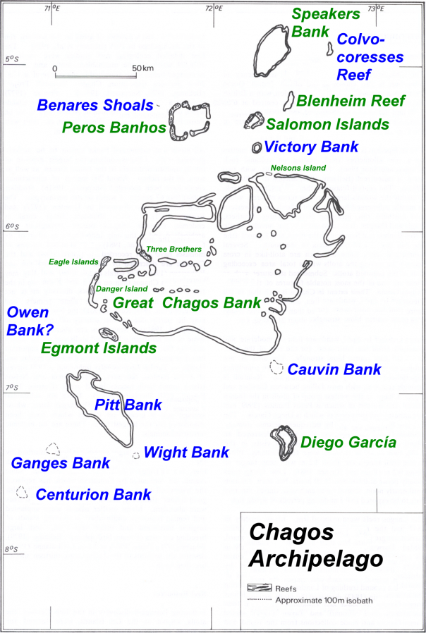 Карта архипелага Чагос. Атоллы с надводной частью выделены зелёным