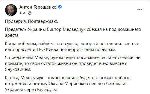 Депутат Верховной рады Виктор Медведчук (фракция "Оппозиционная платформа - За жизнь") сбежал из-​под домашнего ареста, сообщил в соцсетях советник министра внутренних дел Украины Антон Геращенко.
