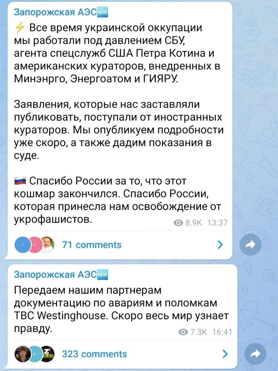Передаем нашим партнерам документацию по авариям и поломкам ТВС Westinghouse. Скоро весь мир узнает правду», — говорится в дальнейших сообщениях.