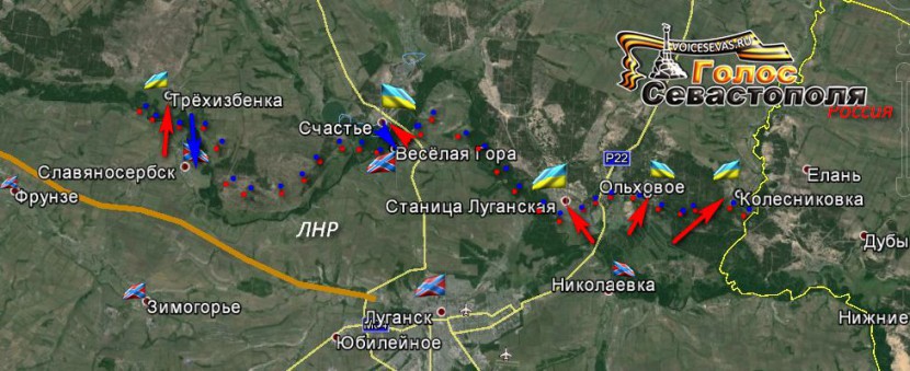 В течение дня украинские силовики обстреливали позиции армии ЛНР в районе н.п. Славяносербск и Весёлая Гора. В результате обстрелов Славяносербска в городе зафиксированы многочисленные повреждения в жилом секторе. Ополчение из РСЗО "Град", САУ "Акация" и "Гвоздика" вело огонь по позициям ВСУ в районе н.п. Ольховое, Колесниковка, Станица Луганская, Трёхизбенка, Счастье.