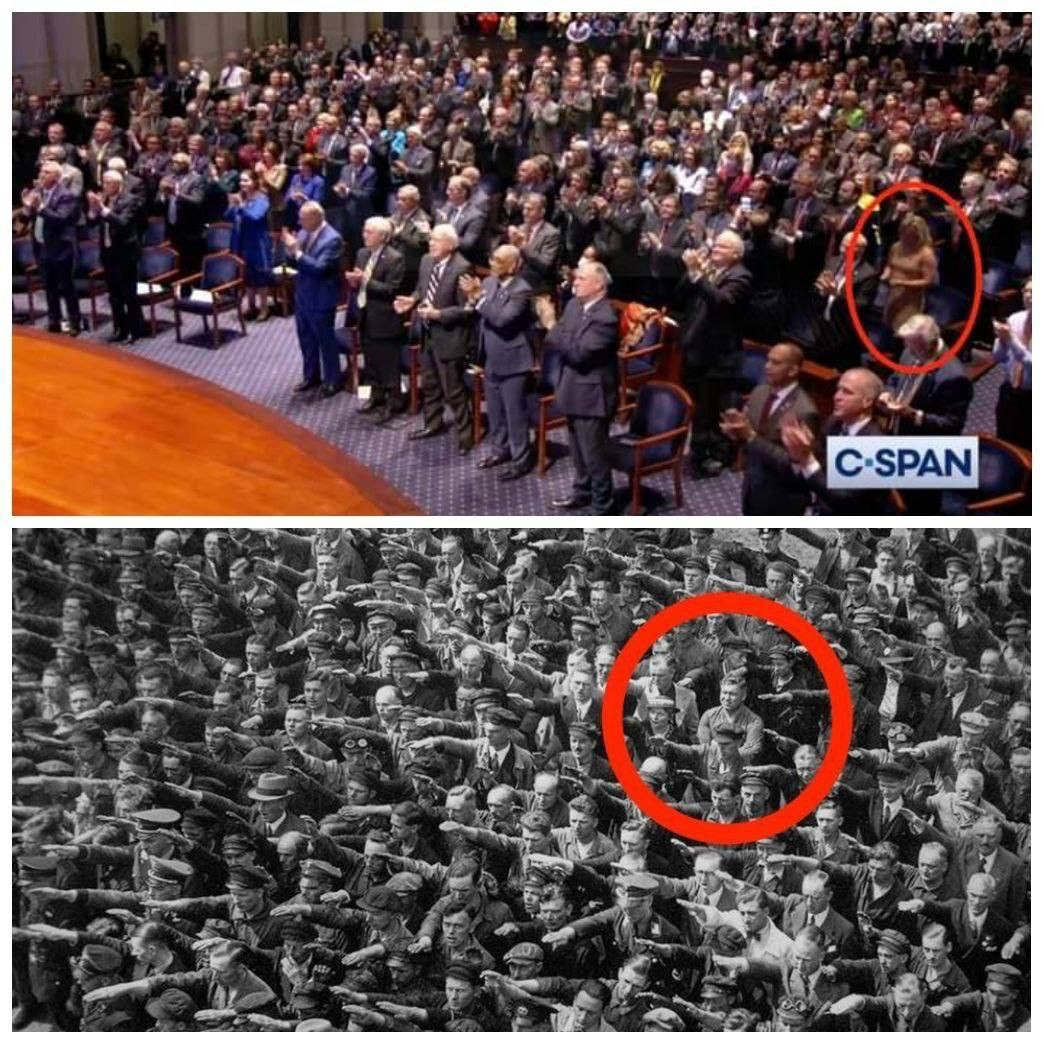 Во время недавнего обращения украинского президента к американскому конгрессу несколько республиканцев его проигнорировали. Политика-республиканца Марджори Тейлор Грин, которая демонстративно не аплодировала Зеленскому, в соцсетях сейчас сравнивают с человеком на фотографии времен фашистской Германии, отказавшимся выполнять нацистское приветствие. Добавим, что Грин открыто выдвигала обвинения в адреса Байдена в финансировании неонацистов на Украине.