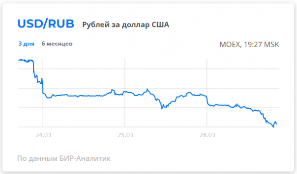 Доллар и евро максимально падали в ходе торгов понедельника до минимумов с 28 февраля: 89,06 рубля и до 96,56 рубля соответственно.
