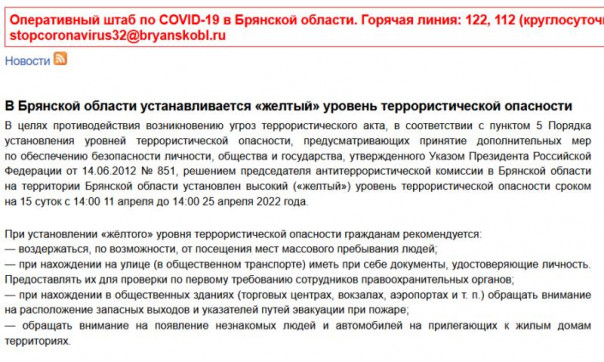 В Воронежской, Брянской, Курской и Белгородской областях до 25 апреля, введён «жёлтый» уровень террористической опасности. Об этом объявили губернаторы Белгородской, Курской, Воронежской и Брянской областей.