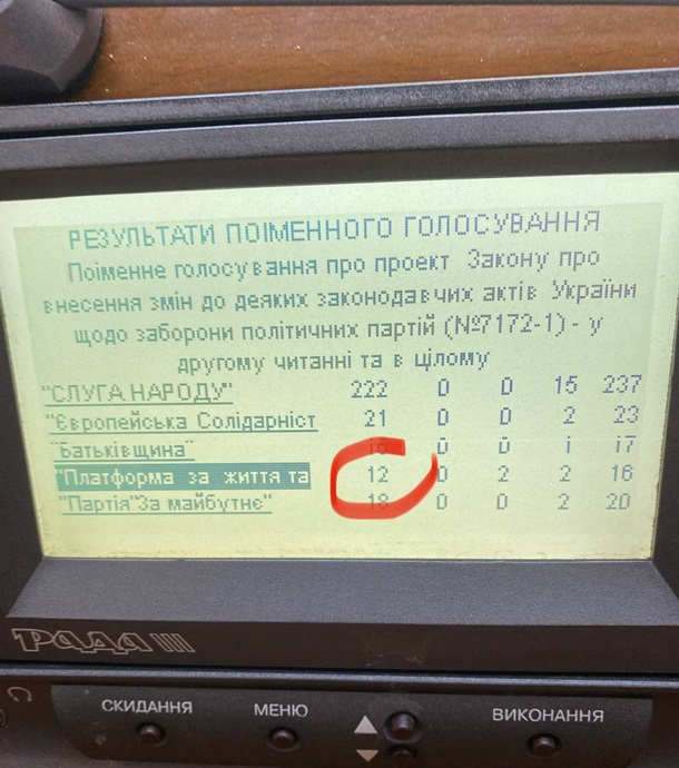 На время военного положения запрещенными были объявлены "Оппозиционная платформа – За жизнь", "Партия Шария", "Наши", "Оппозиционный блок", "Левая оппозиция", "Союз левых сил", "Держава", Прогрессивная социалистическая партия Украины, Социалистическая партия Украины, "Социалисты" и "Блок Владимира Сальдо"