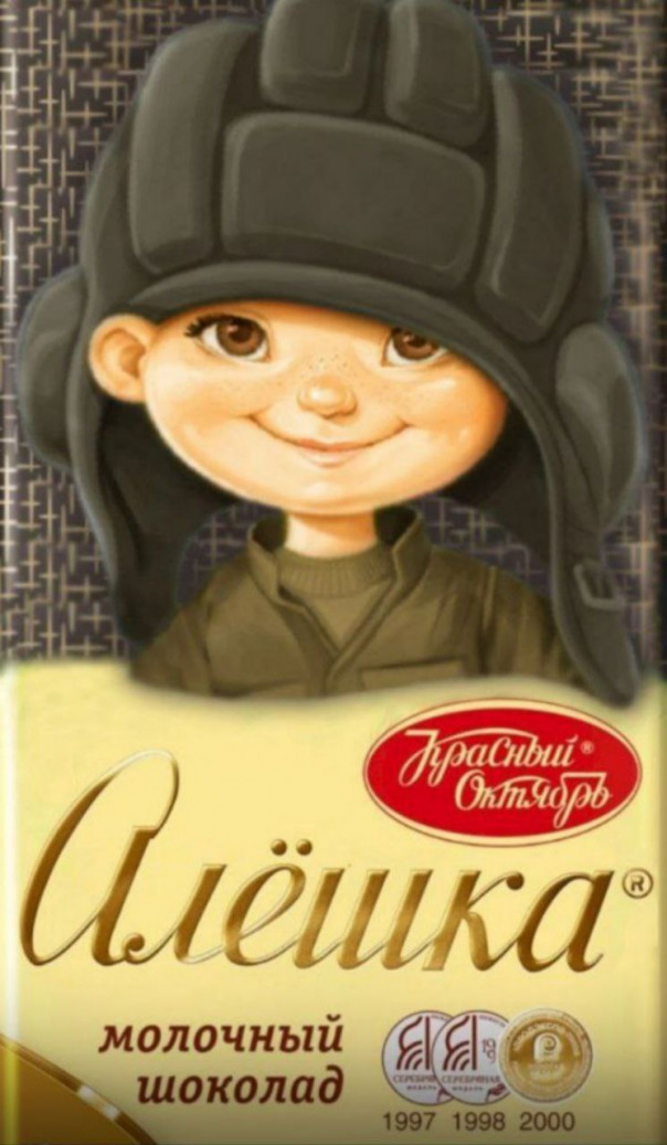 Ламповости в ленту — в сети появился забавный арт с тем самым мальчиком Алешкой из Белгородской области, который ежедневно встречает воинским приветствием колонны российской военной техники. Маленького героя изобразили на всем известной шоколадке от фабрики «Красный октябрь».